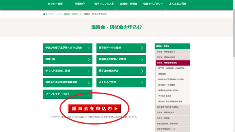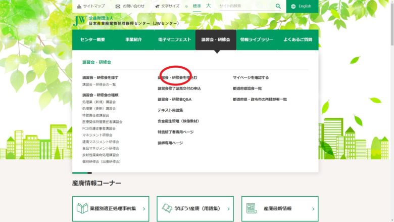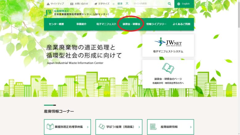 講習を予約する為には「日本産業廃棄物処理振興センター」のホームページにいく必要があります。