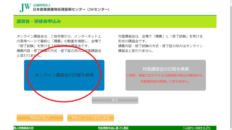 赤い丸印で囲っている部分「オンライン講習会の日程を検索」をクリックします。